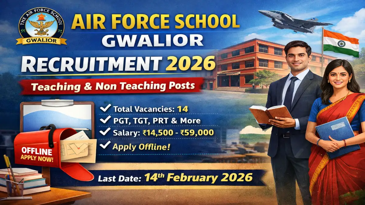Air Force School Gwalior Recruitment 2026: The Air Force School Gwalior Recruitment 2026 includes 14 Teaching & Non Teaching Posts under the latest recruitment notification. The recruitment notification has been officially released by The Air Force School Gwalior. Interested and eligible candidates can apply in offline mode through Speed Post or by submitting the application form at the school premises. The application process has started from the notification date and the last date to submit the application form is 14 February 2026.
