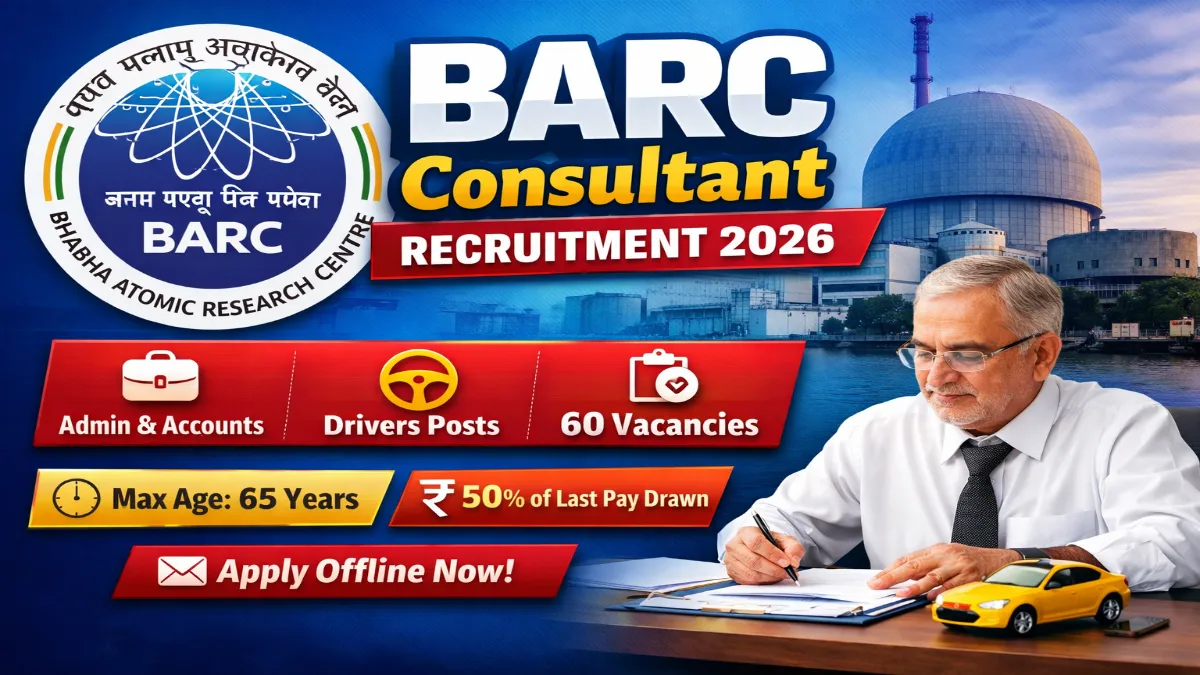 BARC Consultant Recruitment 2026: Bhabha Atomic Research Centre (BARC) Consultant Recruitment 2026 includes 60 Consultant Posts for Admin & Accounts and Drivers under the latest recruitment notification. The recruitment notification has been officially released by Bhabha Atomic Research Centre under the Department of Atomic Energy (DAE). This recruitment is for the re-engagement of retired employees on a contractual basis. Eligible retired candidates can apply in offline mode through the official website. The last date for receipt of the application form is 16 February 2026.