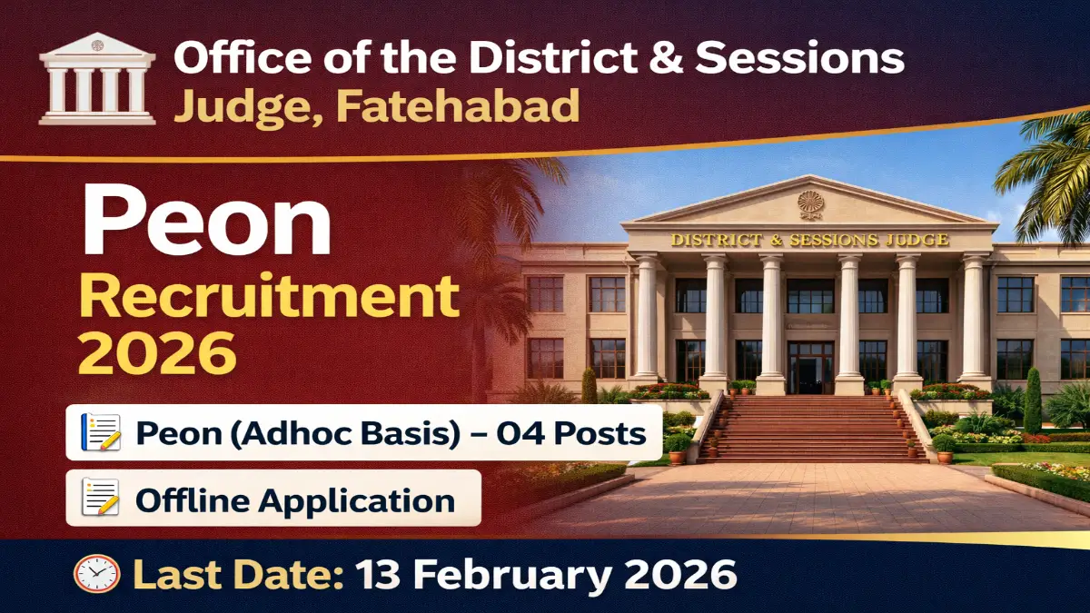 Fatehabad Court Peon Recruitment 2026: Office of the District & Sessions Judge, Fatehabad has released the latest recruitment notification for 04 Peon Posts on an adhoc basis. This recruitment is announced by the Office of the District & Sessions Judge, Fatehabad. Interested and eligible candidates who have passed the Middle Standard Examination can apply in offline mode. The offline application process is already started and the last date to submit the application form is 13 February 2026 (05:00 PM) through the official website fatehabad.dcourts.gov.in.