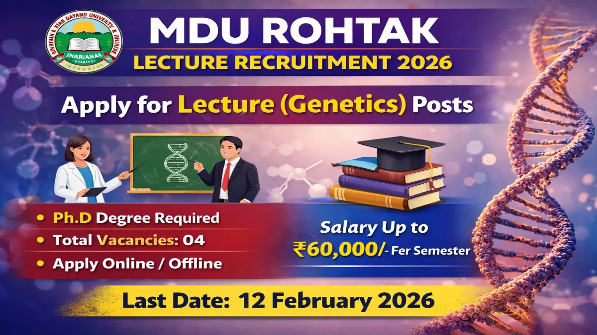 MDU Rohtak Lecture Recruitment 2026: Maharshi Dayanand University (MDU), Rohtak has released the official recruitment notification for 04 Lecture (Genetics) Posts. This recruitment is announced by Maharshi Dayanand University, Rohtak for engaging eligible candidates on a lecture basis. Interested candidates who possess a Ph.D Degree in Genetics or a closely related discipline can apply through Online / Offline mode. The application process will start from 05 February 2026 and the last date to submit the application form is 12 February 2026 through the official website mdu.ac.in.