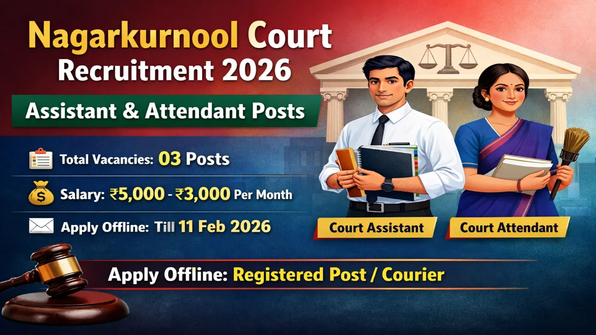 Nagarkurnool Court Recruitment 2026: Nagarkurnool District Court Recruitment 2026 includes 03 Court Assistant & Court Attendant Posts under the latest recruitment notification. The recruitment notification has been officially released by the Nagarkurnool District Court. Eligible candidates can apply in Offline Mode through Registered Post or Courier. The offline application process will start from 28 January 2026 and the last date to submit the application form is 11 February 2026 (up to 05:00 PM).