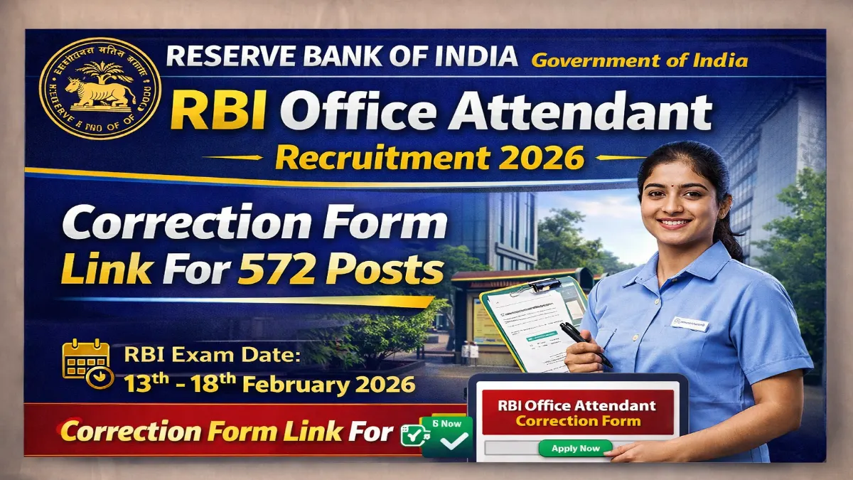 RBI Office Attendant Correction/Edit Form 2026 Out: Reserve Bank of India (RBI) has released the official notification for the recruitment of 572 Office Attendant posts for Panel Year 2025. The recruitment notification has been published on the official RBI website. Eligible candidates who have passed 10th Standard (Matriculation) and fulfill the prescribed eligibility conditions can apply in online mode only through the official portal. The online application process will start from 15 January 2026 and the last date to submit the application form is 04 February 2026. Selection will be done through an Online Test followed by a Language Proficiency Test (LPT).