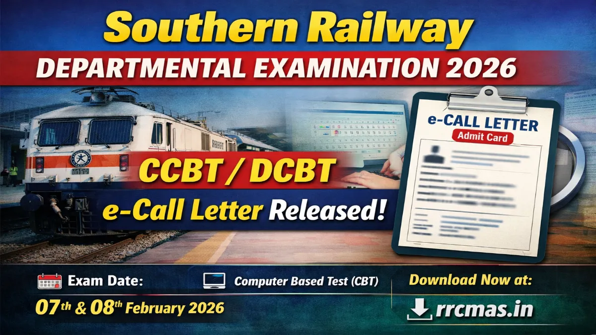 Southern Railway Departmental Promotional Examination 2026: Southern Railway has officially released the Departmental Promotional CCBT / DCBT Examination 2026 e-Call Letter (Admit Card). The admit card is issued for eligible railway employees appearing in the Departmental Promotional Examination 2026. Candidates can download the e-Call Letter in online mode through the official website rrcmas.in. The Computer Based Test (CBT) will be conducted on 07 February 2026 and 08 February 2026. Carrying the admit card is mandatory for appearing in the examination.